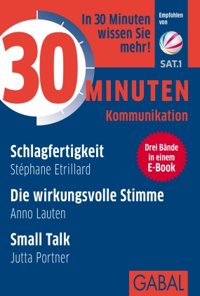 Kommunikative Kompetenz ist im Privatleben so wichtig wie im Beruf. Trainieren Sie Ihre Kommunikation und profitieren Sie davon auch in Verhandlungen, Präsentationen oder im Konfliktmanagement. 30 Minuten Schlagfertigkeit Kommunikation ist die Basis des Austausches zwischen Menschen. Faire Dialektik hat das Ziel, den Gesprächspartner langfristig zu ĂĽberzeugen. Der Bessere gewinnt in einer Diskussion, ohne dass der andere verliert, und die Diskussion macht insbesondere dann SpaĂź, wenn zwei gleich starke Gesprächspartner aufeinandertreffen. Lesen Sie, wie Sie durch Mimik, Gestik und Körpersprache kommunizieren, beim anderen ankommen und Ihren eigenen GefĂĽhlen trauen. 30 Minuten Die wirkungsvolle Stimme Ob im Vorstellungsgespräch, in der Konferenz oder im Meeting – oft werden wir akustisch nicht hinreichend wahrgenommen oder unsere Stimme lässt uns ganz einfach im Stich. Tatsächlich ist die Stimme ein komplexes System, das es zu kennen und zu pflegen gilt. Dieser Ratgeber vermittelt Ihnen auf den Punkt gebracht die Zusammenhänge von Haltung, Atem und Stimme. Praxisnahe Ăśbungen verhelfen Ihnen zu mehr stimmlichem Ausdruck. 30 Minuten Small Talk Haben Sie schon einmal erfolglos versucht, einen möglichst originellen und zugleich geistreichen Gesprächseinstieg zu finden, um so den Grundstein fĂĽr eine gute Beziehung zu legen? Mit ein wenig Ăśbung gelingt Ihnen der Small Talk kĂĽnftig viel leichter. Mit der 30 Minuten Sonderedition erhalten Sie drei Bände in einem und sparen dabei fast 40 Prozent gegenĂĽber den Originalausgaben.
