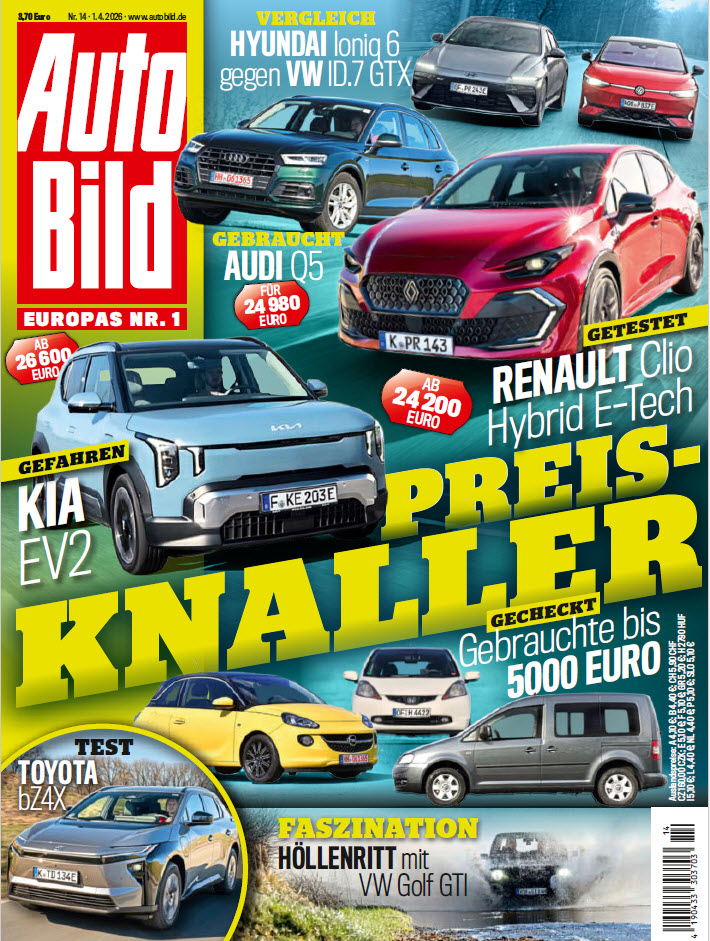 AUTO BILD ist die beliebteste und bekannteste deutsche Autozeitschrift. Jeden Freitag präsentiert sich AUTO BILD durchgehend vierfarbig: mal hart am Blech mit Test- und Technikbeiträgen, mal über die Stoßstangen hinaus mit umfangreichen Servicethemen. Große Neu- und Gebrauchtwagenvergleiche, Werkstatt- und Reifentests, aktuelle Nachrichten und Lesertipps, aber auch Reiseinfos und Versicherungsthemen sind wichtige Teile des redaktionellen Konzepts. Erscheinungsweise: wöchentlich