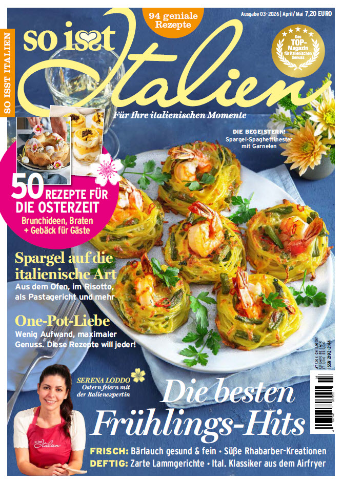 Die italienische Küche ist nach wie vor die beliebteste in Deutschland. Sie verbindet gesunde Ernährung mit Genuss, Tradition und einer ordentlichen Portion Romantik. „So is(s)t Italien“ nimmt uns mit auf Genuss-Reisen durch die italienischen Regionen mit ihren traditionellen Rezepten und ursprünglichen Wochenmärkten, entdeckt für uns Land und Leute und zeigt uns, wie wir die italienische Küche und das ganz besondere Lebensgefühl nach Hause holen. Erscheinungsweise: zweimonatlich