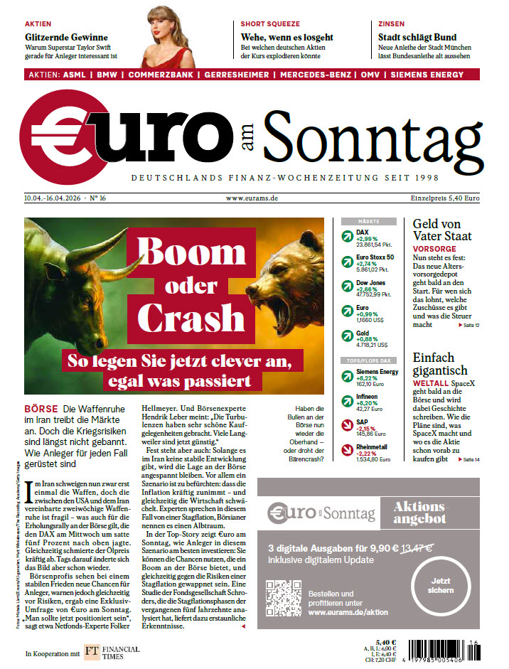 Pünktlich zum Wochenende fasst €uro am Sonntag alle relevanten Neuigkeiten aus Politik, Wirtschaft und Börse zusammen, bewertet sie und gibt einen Ausblick auf die kommende Woche in Form von ausführlichen Hintergrundinformationen und exklusiven Berichten zu Unternehmen.