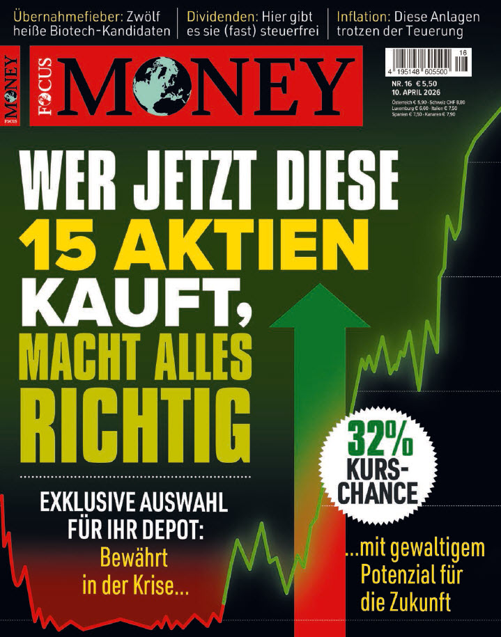 FOCUS-MONEY liefert seinen Lesern ein breites Spektrum aus Wirtschaft, Politik, Unternehmen, Steuern, Recht, Geldanlage und Versicherungen. Profitieren Sie mit FOCUS-MONEY von aktuell recherchierten Wirtschaftsfakten, fundierten Analysen und konkreten Empfehlungen rund um das Thema Geldanlage. Erscheinungsweise: wöchentlich