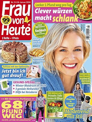 Frau von heute ist die wöchentliche Zeitschrift für moderne Frauen bietet Service, Reportagen, aktuelle Informationen und Star-Porträts zu einem günstigen Preis. Regelmäßig erscheinende Sonderhefte ergänzen das redaktionelle Angebot.