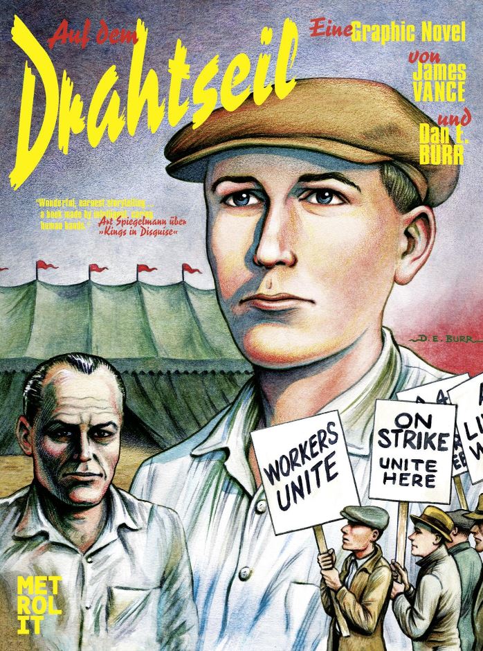 Auf dem Drahtseil erzählt die Geschichte des jungen Fred Bloch, der als Assistent des Entfesselungskünstlers Gordon Corey arbeitet. Corey ist die Hauptattraktion eines großen Wanderzirkus, der durch die USA tourt. Aber der Held hat viele dunkle Seiten. Alkoholmissbrauch, Selbstzweifel und die Geister der Vergangenheit holen ihn ein. Bloch steht ihm bei so gut es geht, aber auch er trägt ein Geheimnis mit sich, das sein Leben zerstören kann. Er sympathisiert mit den Kommunisten und gerät in kriminelle Kreise. Auf dem Drahtseil ist ein episch erzähltes Drama, das in kunstvoll gezeichneten Schwarzweiß-Bildern und sehr virtuos die gesamte Bandbreite narrativen Erzählens auslotet. Für ihr letztes Buch Kings of Disguise erhielten James Vance und Dan E. Burr den renommierten »Eisner-Award«. Es wurde vom Guardian zu einem der 10 wichtigsten Comic-Publikationen aller Zeiten gewählt.