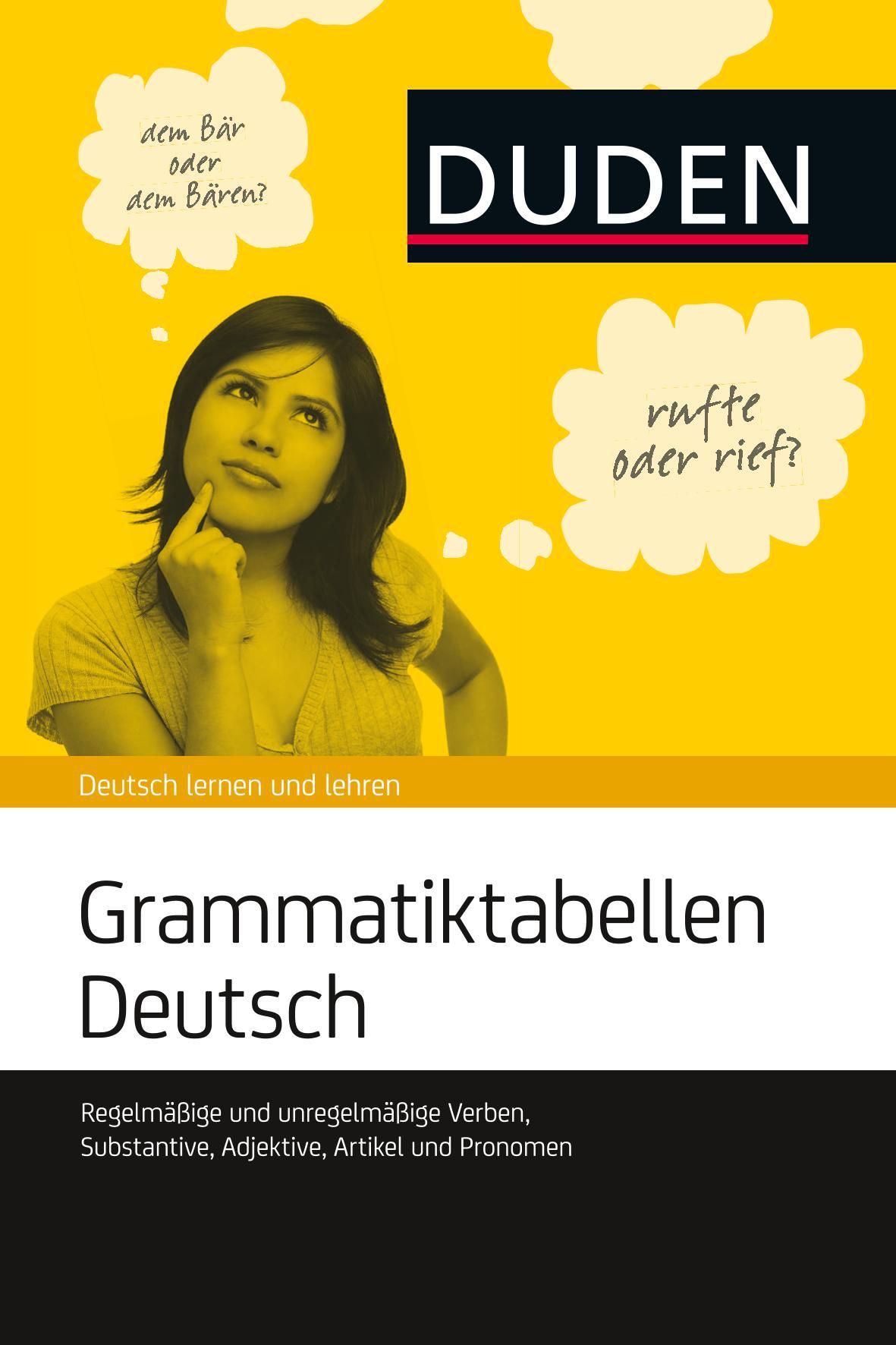 “Ich biege ab, ich bog ab, ich böge ab, ich sei abgebogen …” – die richtigen Formen sind nicht immer gleich bei der Hand. Der handliche und übersichtliche Ratgeber “Grammatiktabellen Deutsch” zeigt alle Flexionsformen der deutschen Sprache einfach und kompakt zum schnellen Nachschlagen und zum Lernen für Schüler, Studierende, Lerner von Deutsch als Fremdsprache und auch Lehrende.