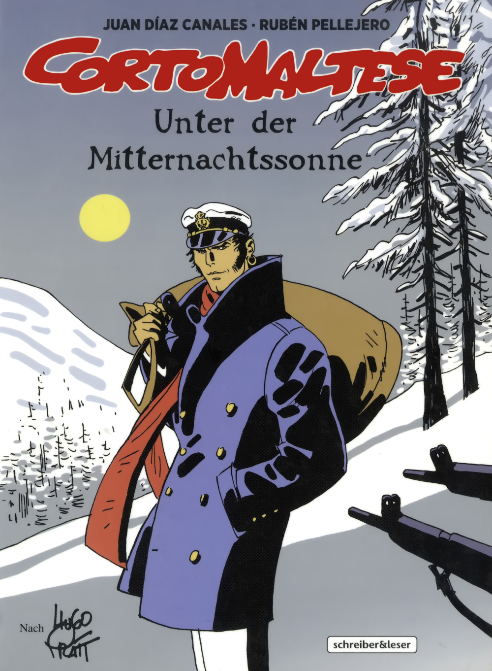 In „Unter der Mitternachtssonne“, das soeben bei Schreiber & Leser mit einem Vorwort von Tristan Garcia („Der beste Teil der Menschen“) erschienen ist, verschlägt es Corto 1915 nach San Francisco, wo ihn ein Brief seines alten Freundes Jack London erwartet – mit der Bitte, einen weiteren Brief ins kanadische Dawson City zu bringen. Der Beginn einer Irrfahrt durch Wasser, Eis, Schnee, Gewalt, Blut und Wahnsinn. Denn der belesene Freigeist mit dem Seesack und der Kapitänsmütze trifft nicht nur den afroamerikanischen Polarforscher Matthew Henson, sondern zudem irische Freiheitskämpfer fern der Heimat, von der Zivilisation verdorbene Inuit und Freudenmädchen, die der Geruch von Schießpulver umgibt. Und natürlich wartet am Ende ein Schatz …