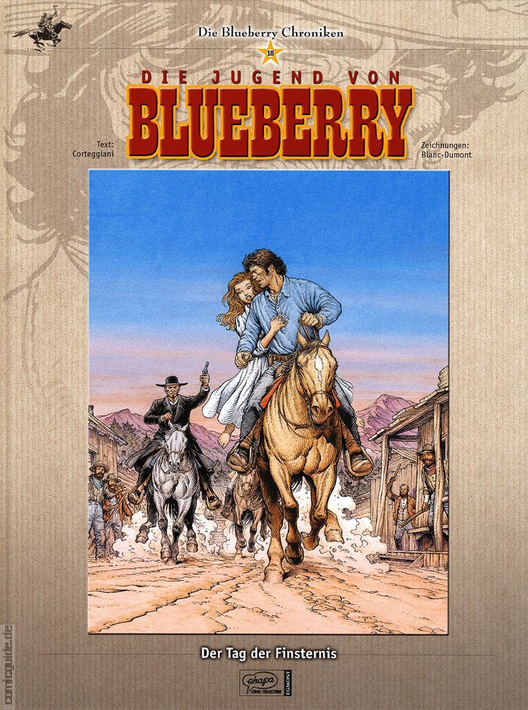 Das erste Blueberry Abenteuer startete am 31. Oktober 1963 im französischen Comicmagazin »Pilote«. Im Laufe von über 40 Jahren, in denen mehr als 40 Alben entstanden, hat sich die Reihe zu einer der bedeutendsten Comicserien aus dem Franko-Belgischen Raum entwickelt und eine immense Popularität erlangt. »Blueberry« zählt ganz sicher zu den wichtigsten Helden, die das Medium Comic hervorgebracht hat. Dies verdankt er dem immensen Talent seiner Schöpfer J.-M. Charlier und Jean Giraud (alias Moebius), zwei Übervätern der Comicbranche. Mit den »Blueberry Chroniken« startet die Ehapa Comic Collection die von Fans lange erwartete »Blueberry«-Werkausgabe. In dieser Reihe werden alle Abenteuer, an denen Jean Giraud beteiligt war, im Hinblick auf die Handlung chronologisch zum Abdruck gebracht. So werden im ersten Band Blueberrys Jugendabenteuer enthalten sein, dann geht es mit den Leutnant- und Marshal Blueberry Abenteuern weiter um mit dem Mister Blueberry-Zyklus den Abschluss dieser hochwertigen, auf zwölf Bände angelegten Reihe zu bilden. Jeder Band enthält 2-4 Alben sowie einen ausführlichen redaktionellen Teil, in dem zu zahlreichen Hintergrundinformationen bisher unveröffentlichtes Material abgedruckt wird.