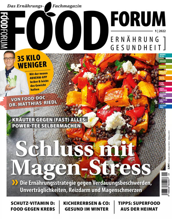 Entdecken Sie jetzt FOODFORUM, das Magazin für alle, die gerne mehr über Food- und Diät-Trends wissen möchten. In unseren Artikeln geht es darum, wie Ernährung unseren Organismus beeinflusst, wie Essen auf Körper und Psyche wirkt und letztendlich entscheidenden Einfluss darauf hat, wie lange wir leben. Ganzheitliche Kompetenz der besten Experten aus Medizin, Ernährungs- und Bewegungswissenschaft, Naturheilkunde und Psychologie. Dazu Tests und thematisch passende Rezepte. Viel Vergnügen beim Lesen!