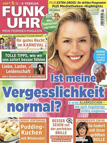 Die Programmzeitschrift speziell für Frauen informiert rund um den ausführlichen Programmteil jede Woche über Themen wie Gesundheit, Partnerschaft, Mode und Reise. Funk Uhr ist die Programmzeitschrift, die auf acht seiten pro Tag umfassende Programminformationen bietet. Rund um das ausführliche TV-Programm präsentiert der Mantelteil eine Fülle von Service- und Unterhaltungsgeschichten: Kompetente Berichterstattung zu den Schwerpunktthemen Gesundheit und Wellness. Hintergrundinformationen und aktuelle News zu Themen wie Ernährung, Mode und Beauty sowie Partnerschaft, Geld und Wissen. Vielseitige Unterhaltungsgeschichten sowie Reportagen und Interviews mit TV -Stars und -Machern.