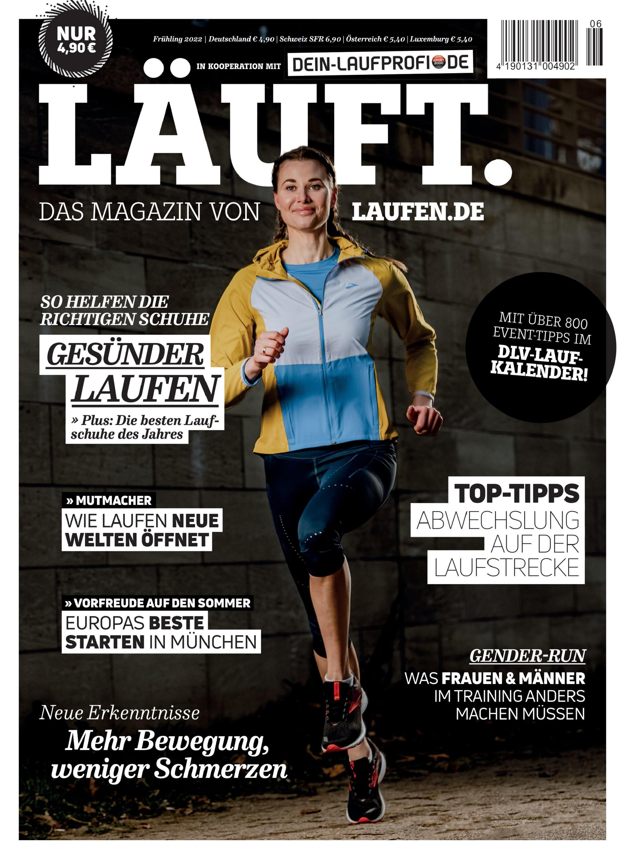 LÄUFT. ist das gedruckte Magazin von laufen.de: 100 Seiten, vollgepackt mit den besten Tipps, Geschichten und Bildern für alle, die gern laufen und lesen. Zentrale Themen rund ums Laufen in allen Facetten sind Events, Training, Ernährung, Mode und Equipment.