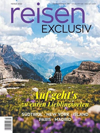 Die Reporter von REISEN Exklusiv beschreiben ferne Länder, exotische Destinationen und aufregende Abenteuer. Das internationale Reisemagazin bringt den Duft der großen, weiten Welt in die Wohnzimmer seiner Leser. Unter redaktionellen Fixpunkten wie Hotel News, Reise Tipps, Kreuzfahrten, und City Shots werden die Leser über luxuriöse Unterkünfte, interessante Destinationen und tolle Lifestyle- Produkte informiert.