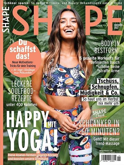 Die angesagtesten Fitness-Accounts bei Instagram, die heißesten Trend-Workouts, kreative Rezepte und die interessantesten neuen Produkte – all das und mehr finden Sie in der Zeitschrift SHAPE. Alle Lebensbereiche von aktiven Frauen werden abgedeckt – in all ihren Facetten: Neben Fitness und Ernährung geht es auch um Mode und Beauty, Reisen und Psychologie, Wellness und Achtsamkeit. Erfahren Sie, wie Sie mit Hilfe von Yoga Ihr Bindegewebe straffen können, welche Übungen Ihren Rücken stärken und welche Outfits beim Sport Ihre Vorzüge betonen. Begleiten Sie Frauen, die berichten, wie sie abgenommen haben und/oder fitter geworden sind, auf ihrem Weg, und lassen sich von diesen persönlichen Geschichten in SHAPE motivieren.Außerdem in jeder Ausgabe von SHAPE: Horoskop, Gewinnspiele, Tests und eine Sport-Playlist. Das monatlich erscheinende Magazin wird in 30 Ländern herausgegeben und zählt somit zu den größten Fitnessmagazinen für Frauen weltweit.